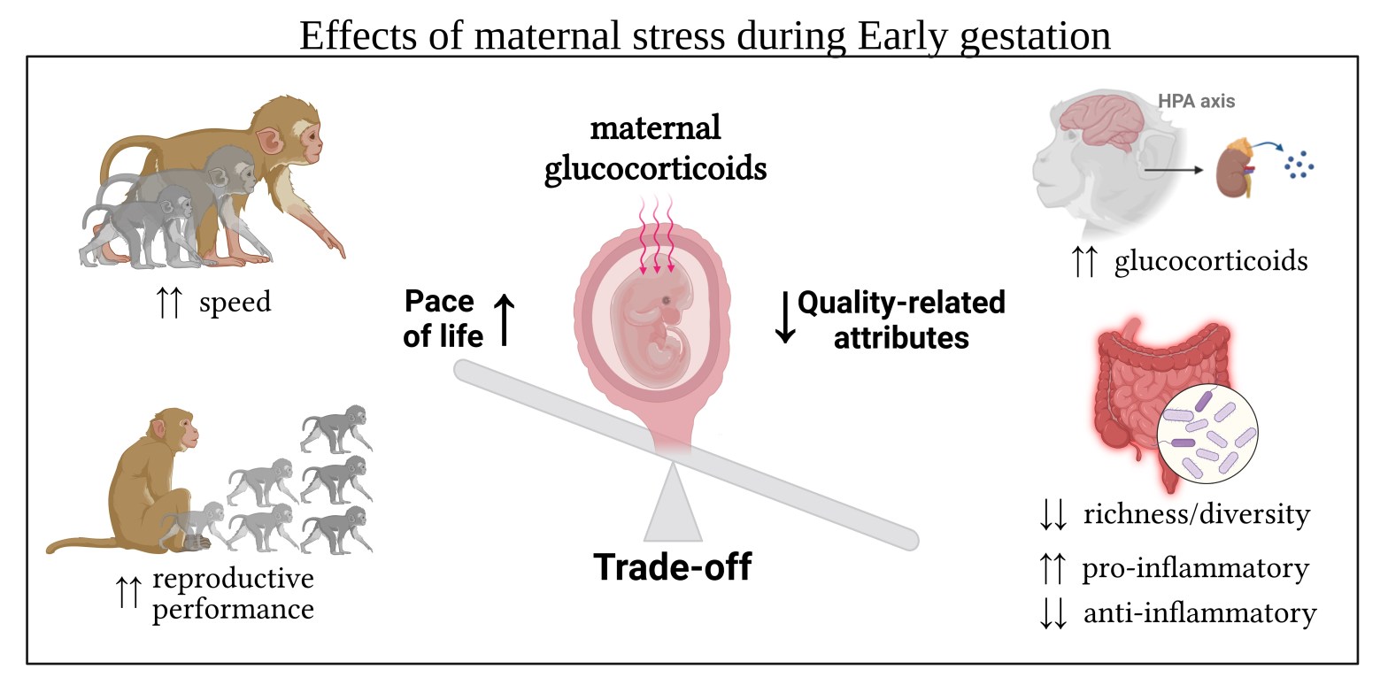 Overall, my work shows evidence of long-term detrimental effects of a not-traumatic and naturally driven increase of prenatal maternal stress combined with growth acceleration: prenatally challenged offspring accelerates their life-history pace by increasing growth and speeding up reproduction at the cost of a higher allostatic load and “wear and tear” of physiological systems which can negatively impact morbidity and reduce lifespan.